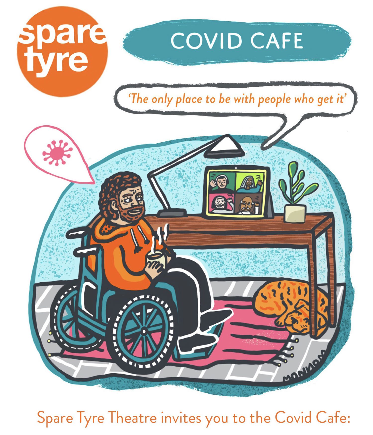 Image: Illustration by Monique of person in wheelchair at a desk engaging on a 'Covid Cafe' Session