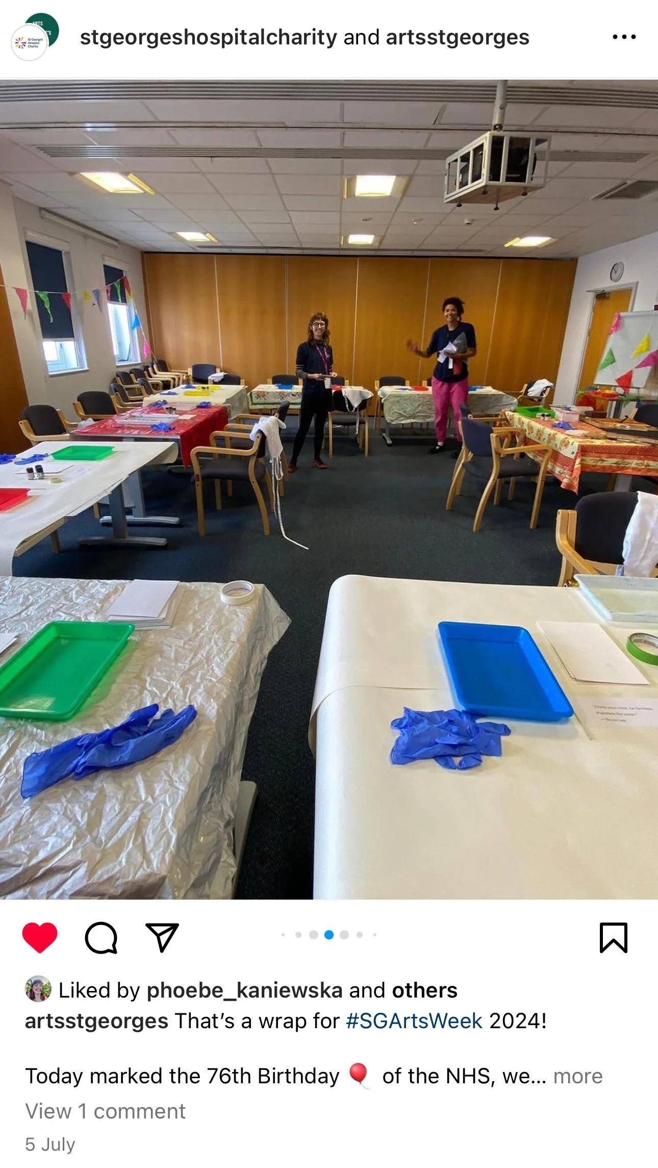 “Building on the success of the Resident Artists initiative at St George’s Hospital, and with thanks to a generous £10,000 donation from the Friends of Queen Mary’s Hospital, St George’s Hospital Charity Arts Team have been delighted to expand their programme, appointing a professional musician and professional visual artist (Monique) to plan and lead high-quality creative sessions with patients, their families and staff, helping improve the experience of being in Queen Mary’s Hospital.