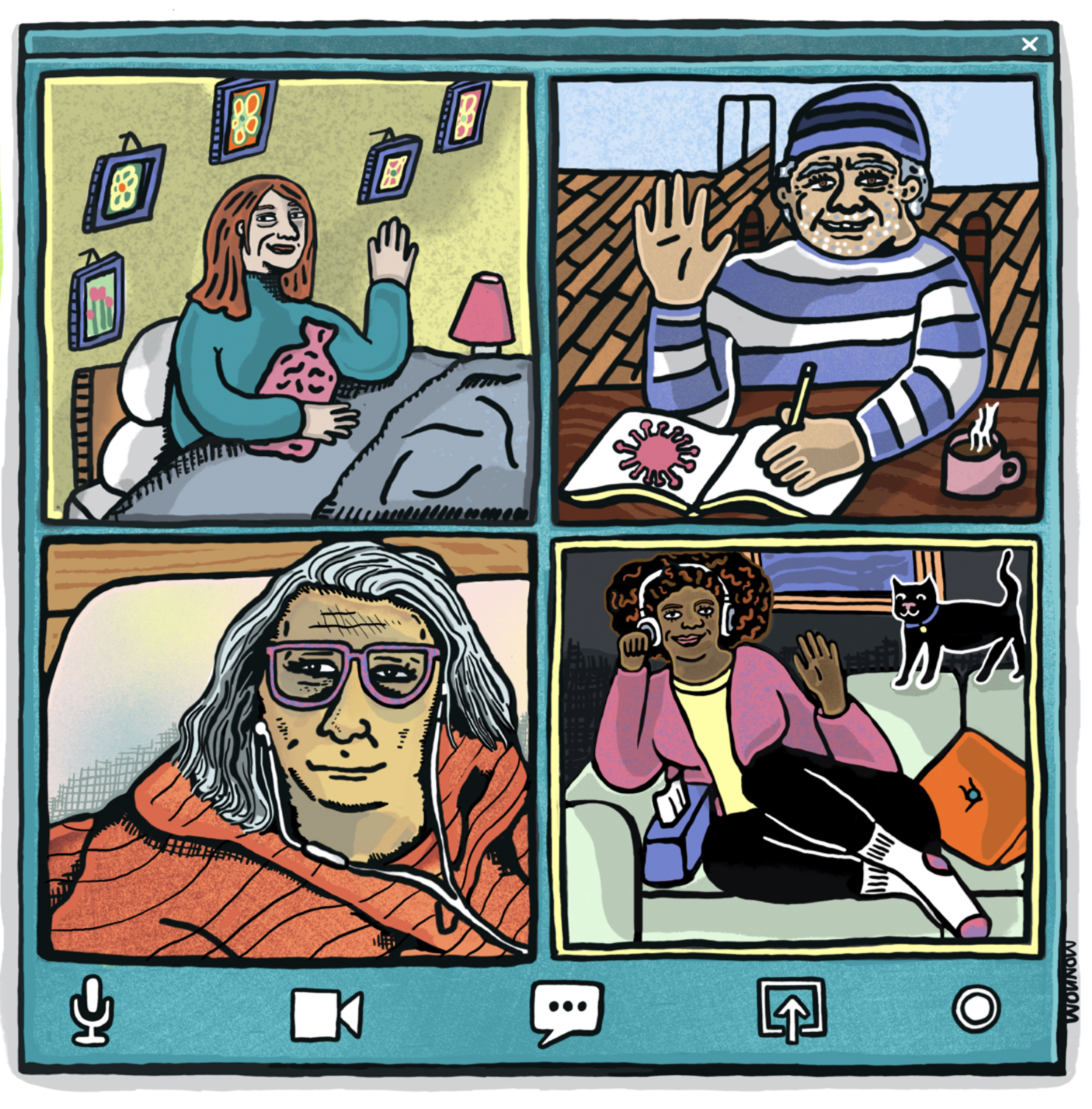 Image: Illustration by Monique of a Covid Cafe session, four people in different squares engaging in an online meeting.